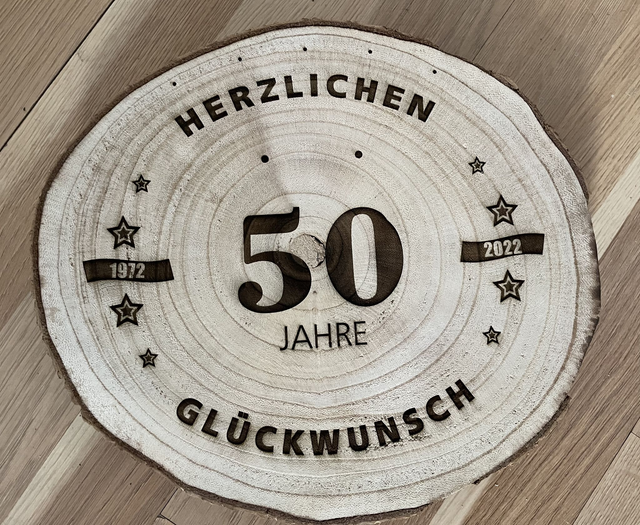 Gravur auf Naturholz Dekoscheiben, kann wegen der Maserung in den unterschiedlichen Farben ausfallen.