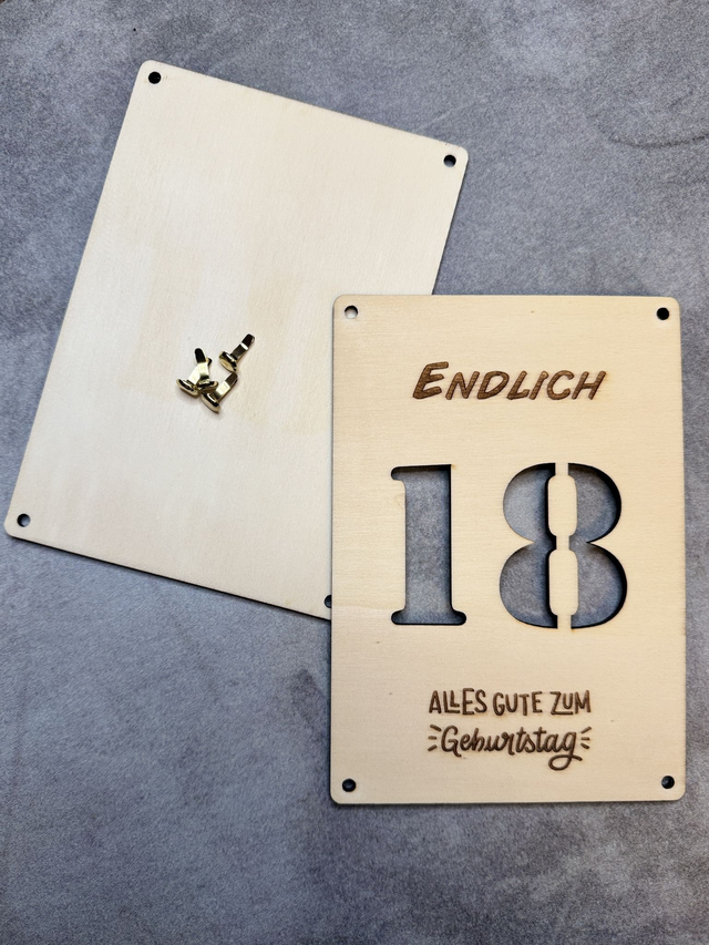 Die Geldgeschenk-Karte ist aus 3 mm Sperrholz hergestellt. Sie besteht aus eine Frontseite, auf der das Motiv ausgeschnitten und der Text eingraviert ist. Dazu gehört eine blanko Platte als Rückseite. Zwischen den zwei Platten werden die Geldscheine (sichtbar durch den Ausschnitt) platziert und die Frontseite wird mit 4 Brads (in der Lieferung erhalten) mit der Rückseite verbunden.