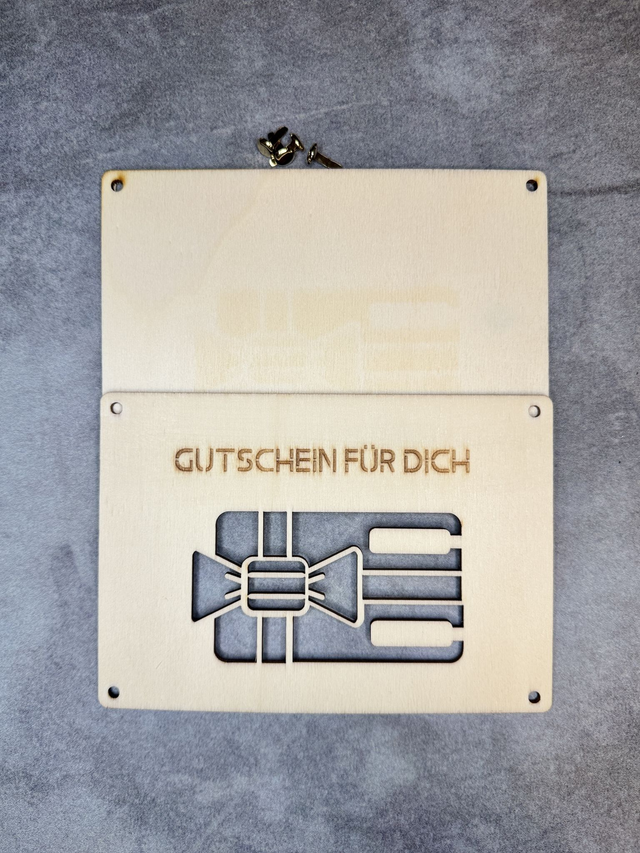 Die Geldgeschenk-Karte ist aus 3 mm Sperrholz hergestellt. Sie besteht aus eine Frontseite, auf der das Motiv ausgeschnitten und der Text eingraviert ist. Dazu gehört eine blanko Platte als Rückseite. Zwischen den zwei Platten werden die Geldscheine (sichtbar durch den Ausschnitt) platziert und die Frontseite wird mit 4 Brads (in der Lieferung erhalten) mit der Rückseite verbunden.