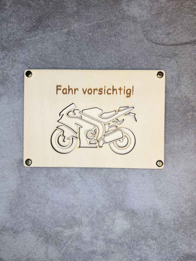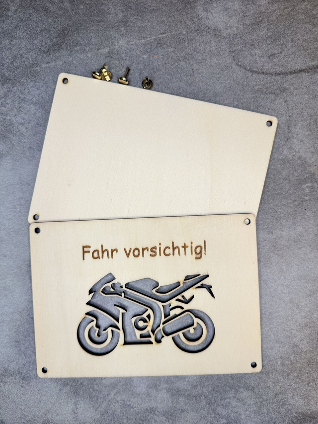 Die Geldgeschenk-Karte ist aus 3 mm Sperrholz hergestellt. Sie besteht aus eine Frontseite, auf der das Motiv ausgeschnitten und der Text eingraviert ist. Dazu gehört eine blanko Platte als Rückseite. Zwischen den zwei Platten werden die Geldscheine (sichtbar durch den Ausschnitt) platziert und die Frontseite wird mit 4 Brads (in der Lieferung erhalten) mit der Rückseite verbunden.