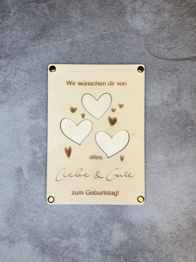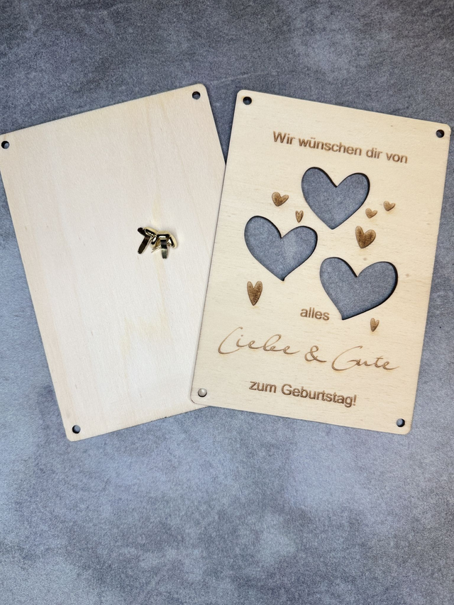 Die Geldgeschenk-Karte ist aus 3 mm Sperrholz hergestellt. Sie besteht aus eine Frontseite, auf der das Motiv ausgeschnitten und der Text eingraviert ist. Dazu gehört eine blanko Platte als Rückseite. Zwischen den zwei Platten werden die Geldscheine (sichtbar durch den Ausschnitt) platziert und die Frontseite wird mit 4 Brads (in der Lieferung erhalten) mit der Rückseite verbunden.