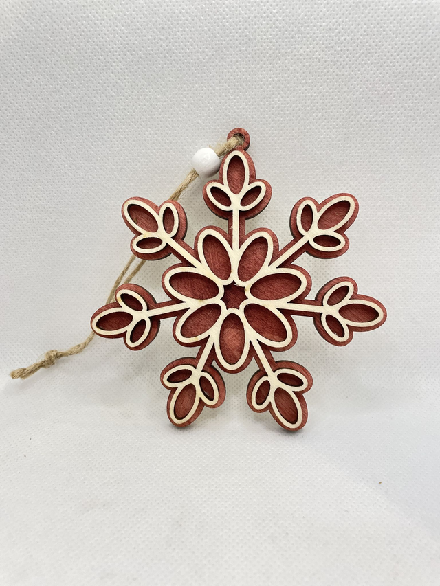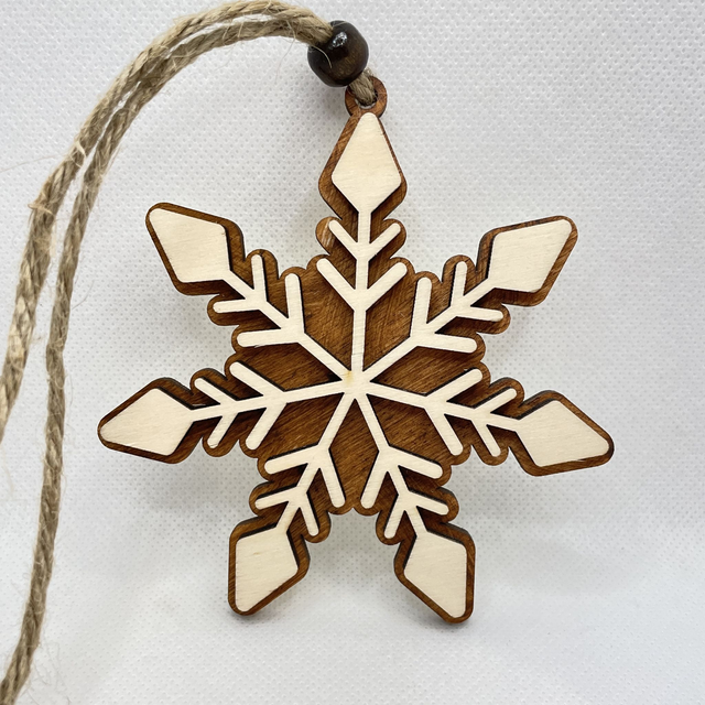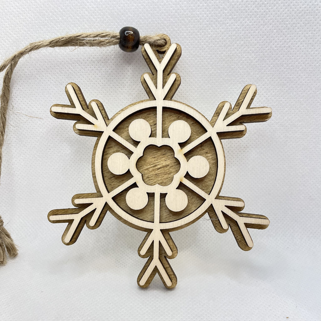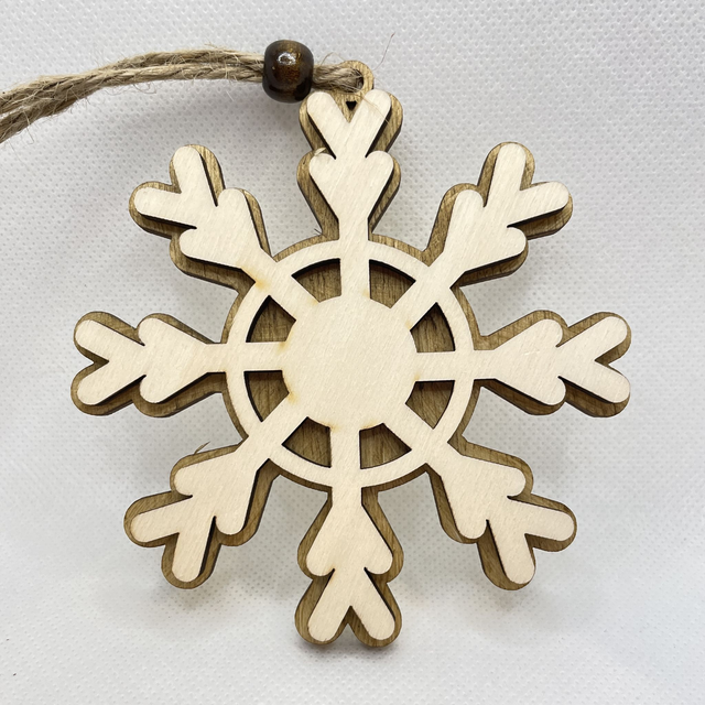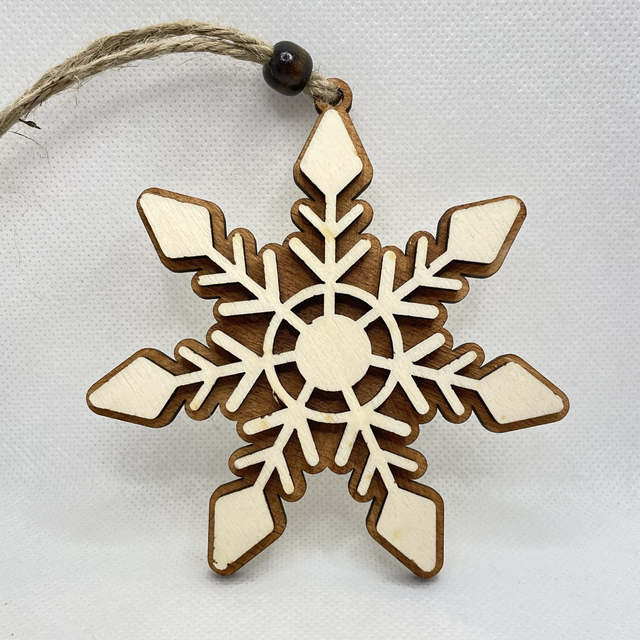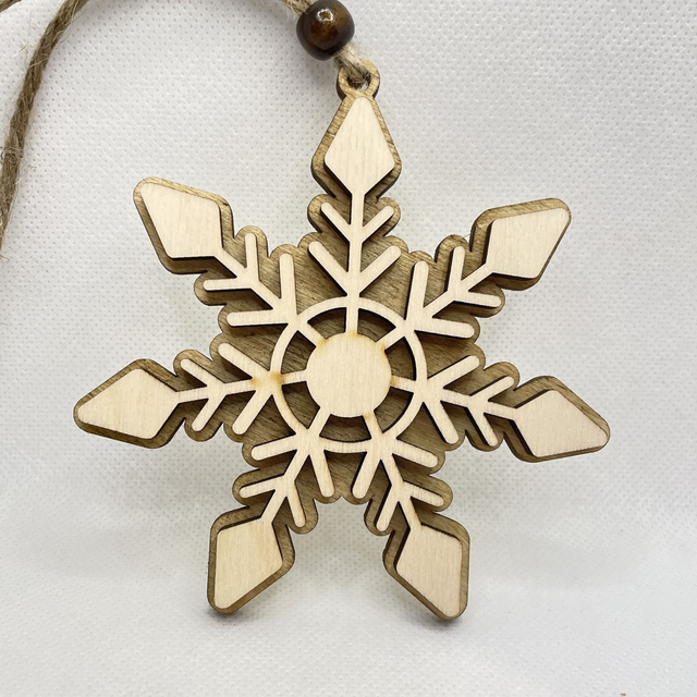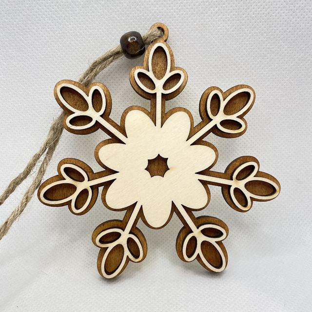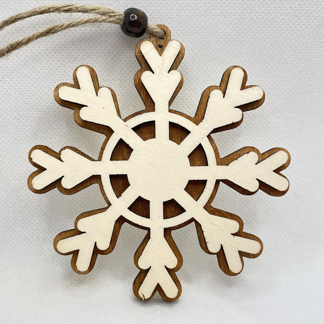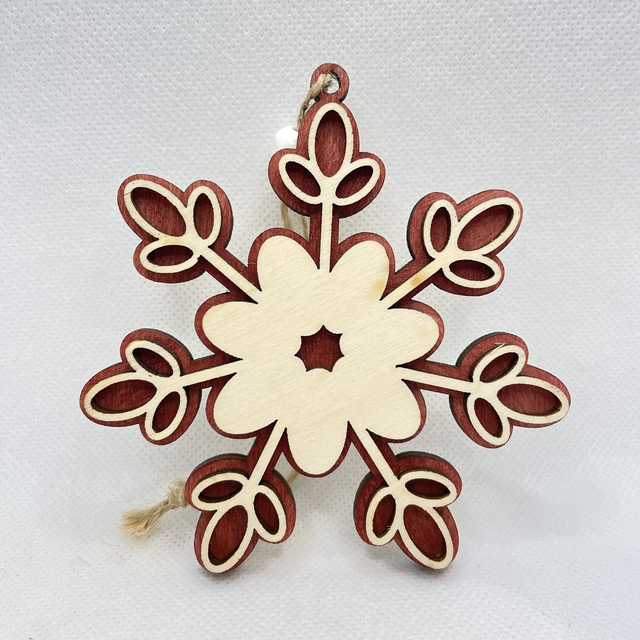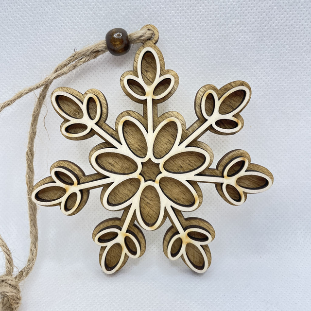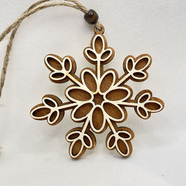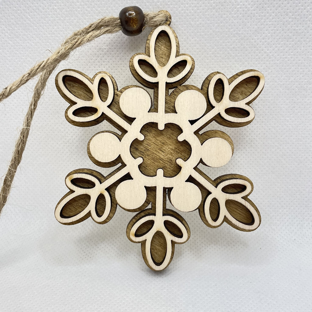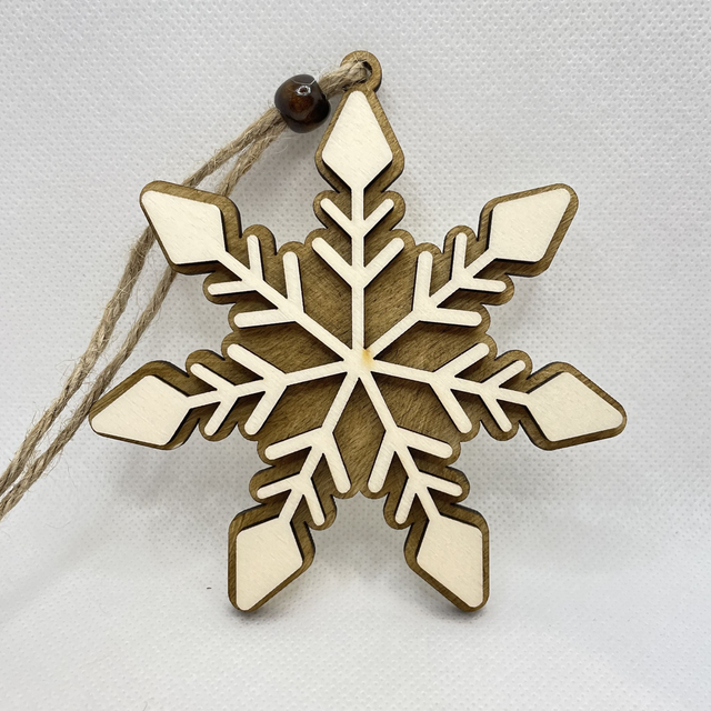 Jede Schneeflocke ist aus 2 Schichten Sperrholz hergestellt. Sie besteht aus eine Bodenplatte, die in verschiedenen Farben erhältlich ist und aus eine Oberschicht in Naturfarben. Die beiden Sperrholz Schichten sind verklebt und verleihen der Schneeflocke einen edlen 3D Look. Eine Holzperle, befestigt an der Juteschnur verschönert diesen Anhänger.