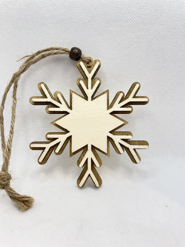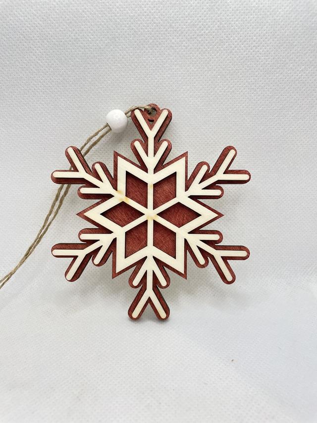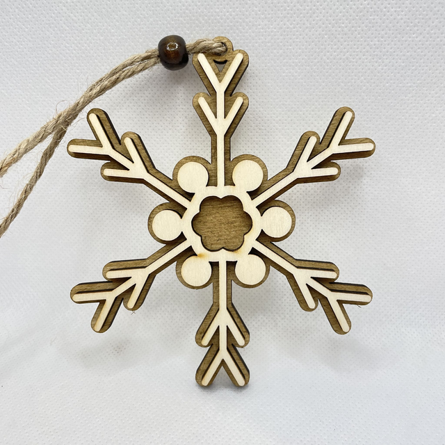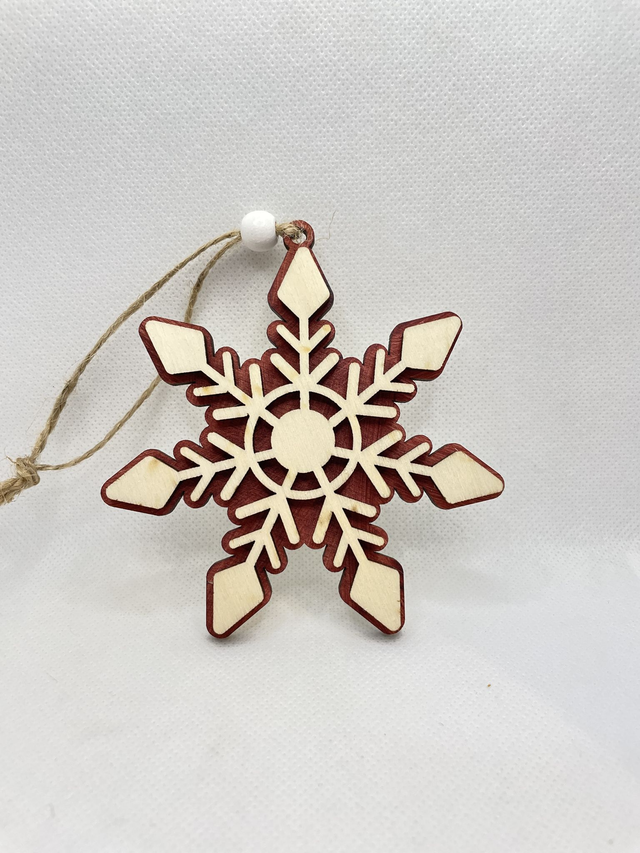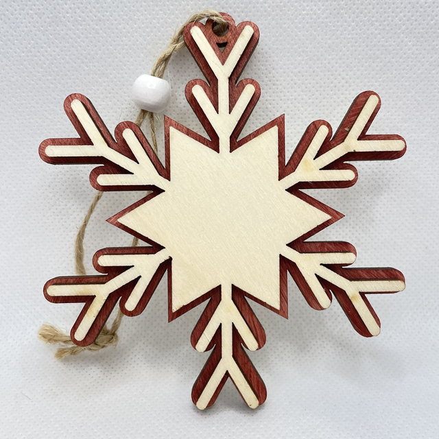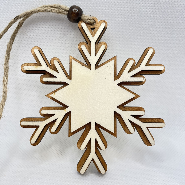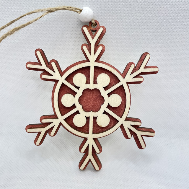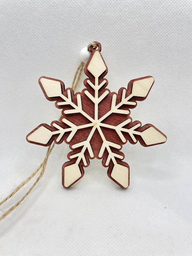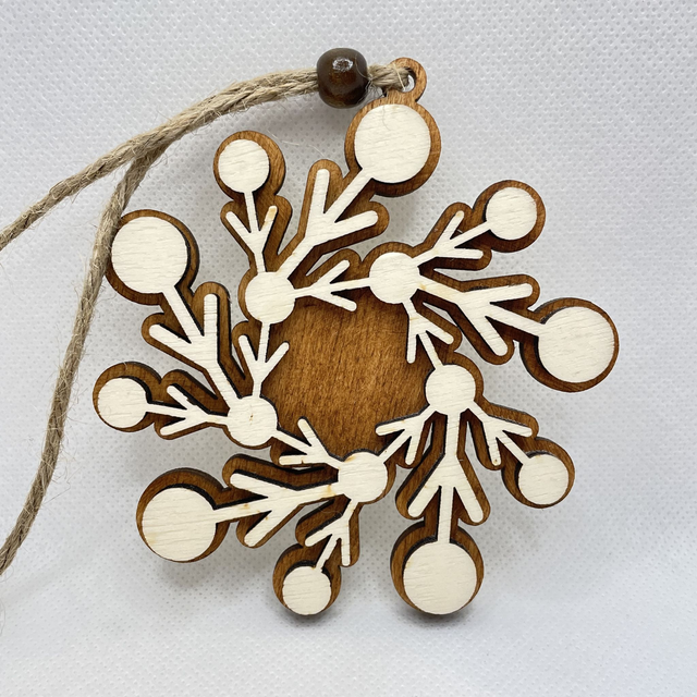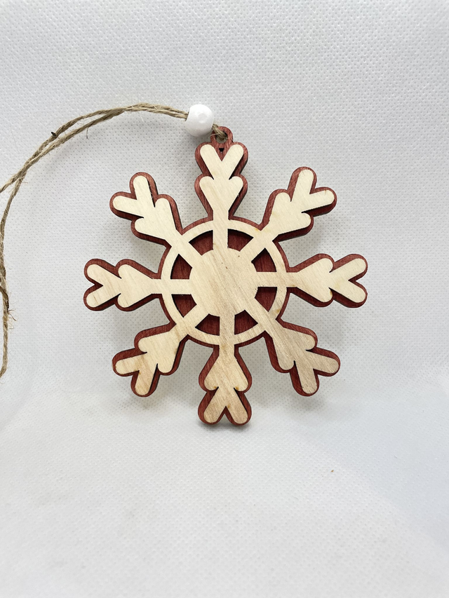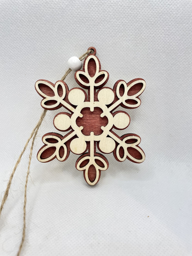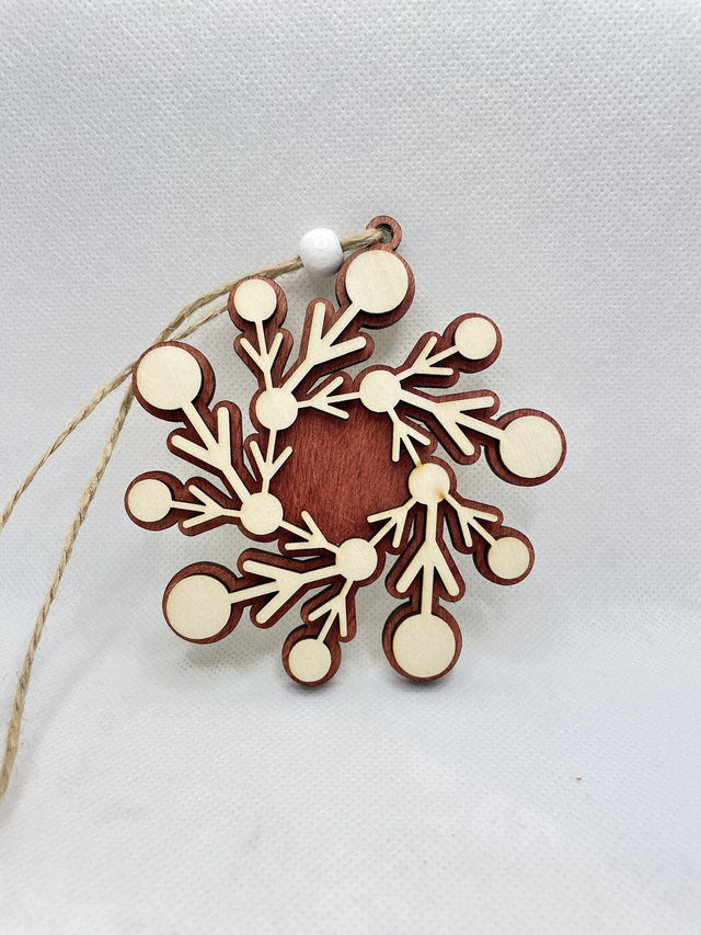 Jede Schneeflocke ist aus 2 Schichten Sperrholz hergestellt. Sie besteht aus eine Bodenplatte, die in verschiedenen Farben erhältlich ist und aus eine Oberschicht in Naturfarben. Die beiden Sperrholz Schichten sind verklebt und verleihen der Schneeflocke einen edlen 3D Look. Eine Holzperle, befestigt an der Juteschnur verschönert diesen Anhänger.